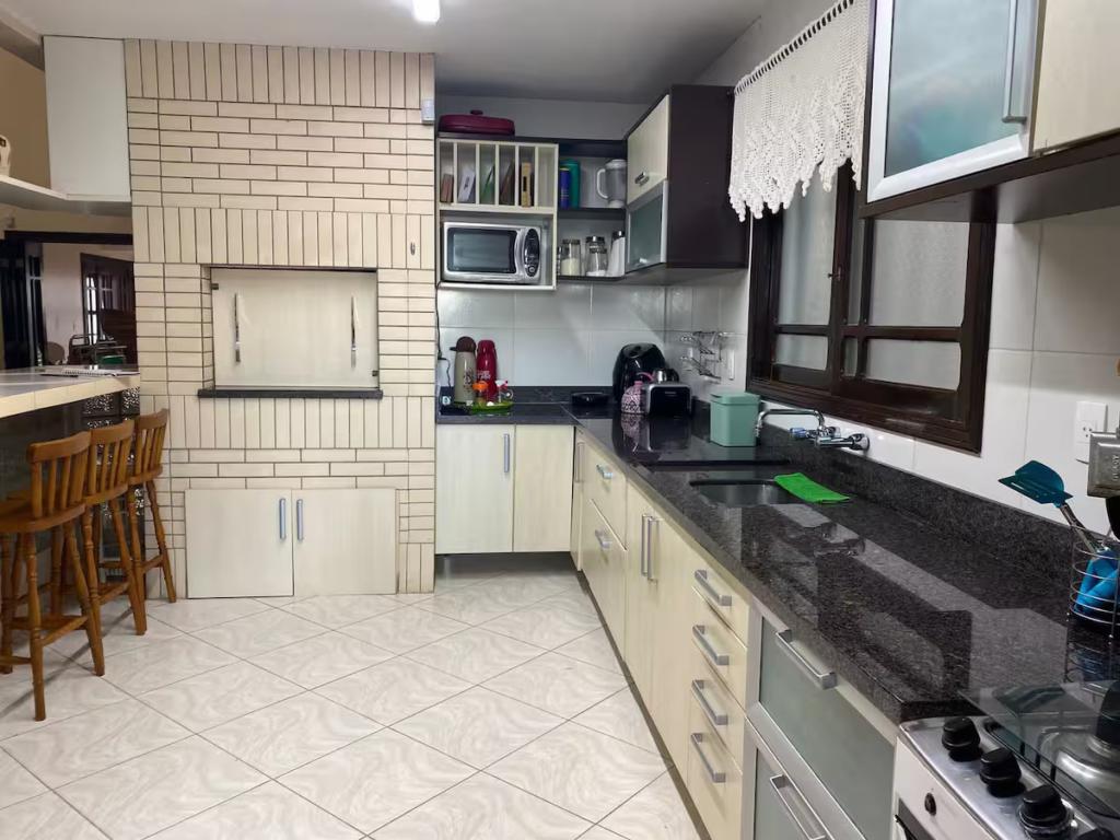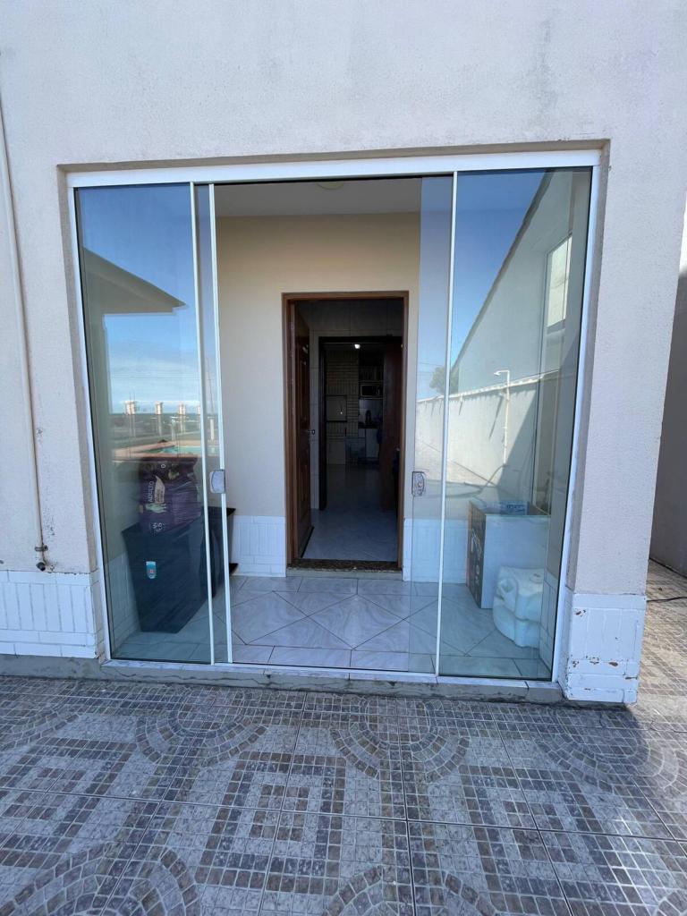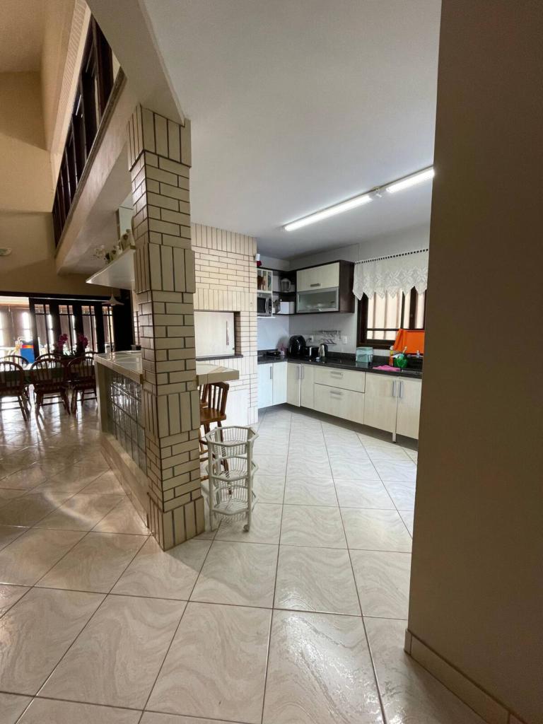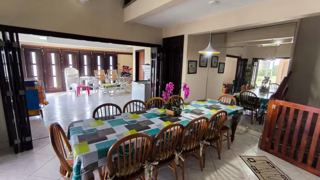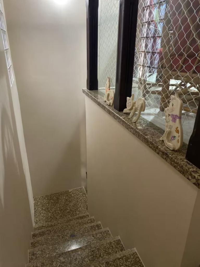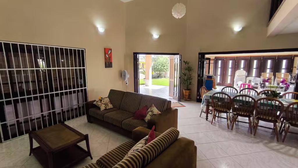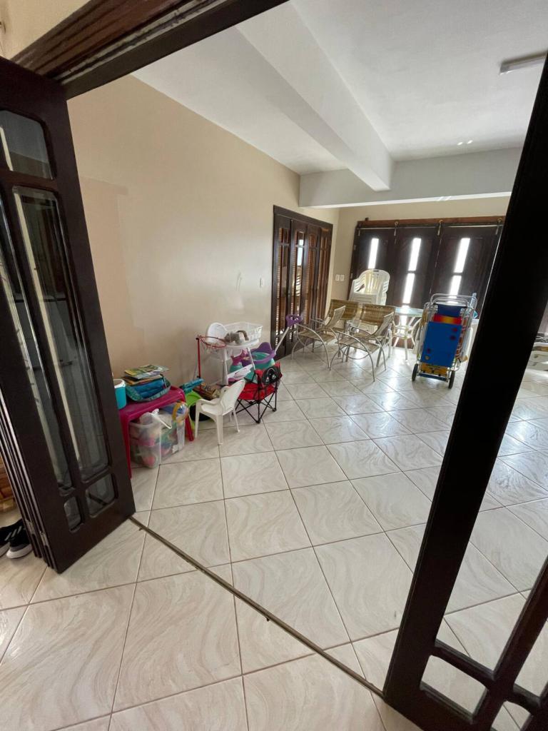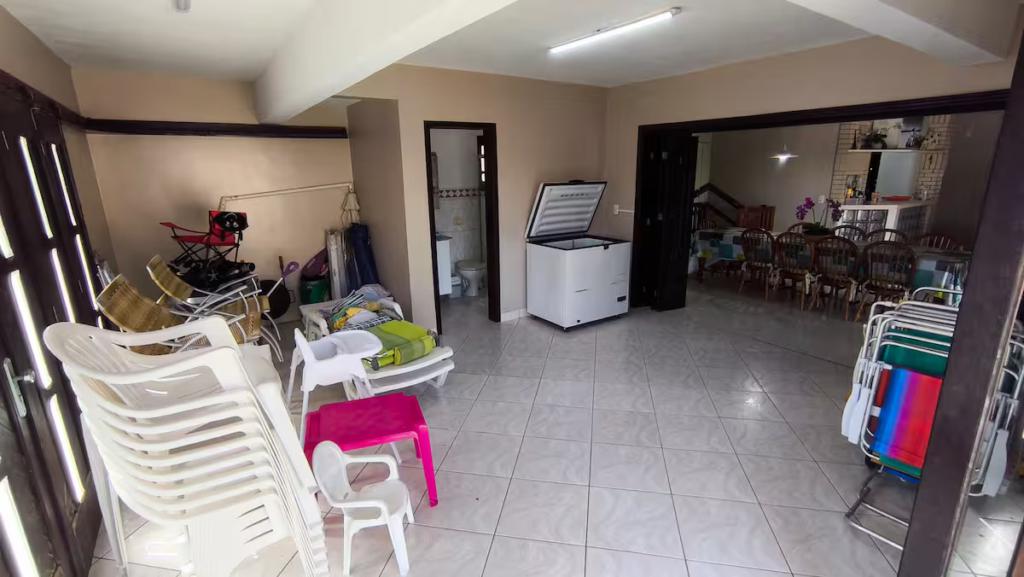 No pátio externo, piscina cercada, chuveiro para retorno da praia, jardim amplo e ensolarado, ideal para convivência ao ar livre. A casa ocupa dois terrenos juntos, garantindo área externa diferenciada, com acessos por três laterais, circulação fácil e vagas de garagem. No pavimento superior, a varanda é protegida por telas, oferecendo segurança e conforto para toda a família.