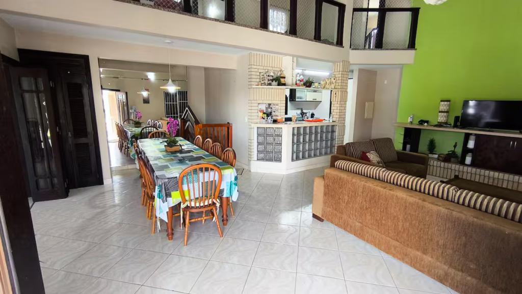 Residência frente mar, distribuída em dois pavimentos, oferecendo conforto, privacidade e integração entre os ambientes. São 4 dormitórios ao todo, sendo 3 suítes, todos climatizados. A área social integra sala de estar, jantar e cozinha completa, com janelas amplas que proporcionam vista direta para o mar e excelente iluminação natural.