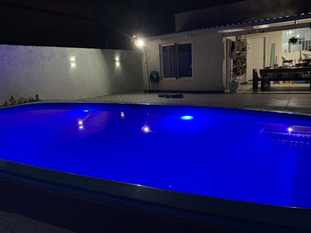 A área externa é um destaque: piscina em fibra medindo aproximadamente 7,00 x 3,50 m com cascata, iluminação em LED e quadro de comando. O entorno conta com deck em pedra atérmica, espaço para 1 a 2 carros, corredor lateral com arandelas e calçamento em estilo Copacabana.